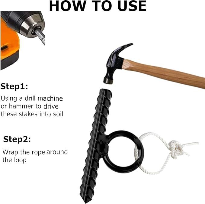 • Multiple Applications: The ground stakes are suitable for securing camping tents, backpacking, trampolines, tarp, garden cloth, picnic tables, dog, horse, cow or any animal rope tie down, retaining walls, sheds