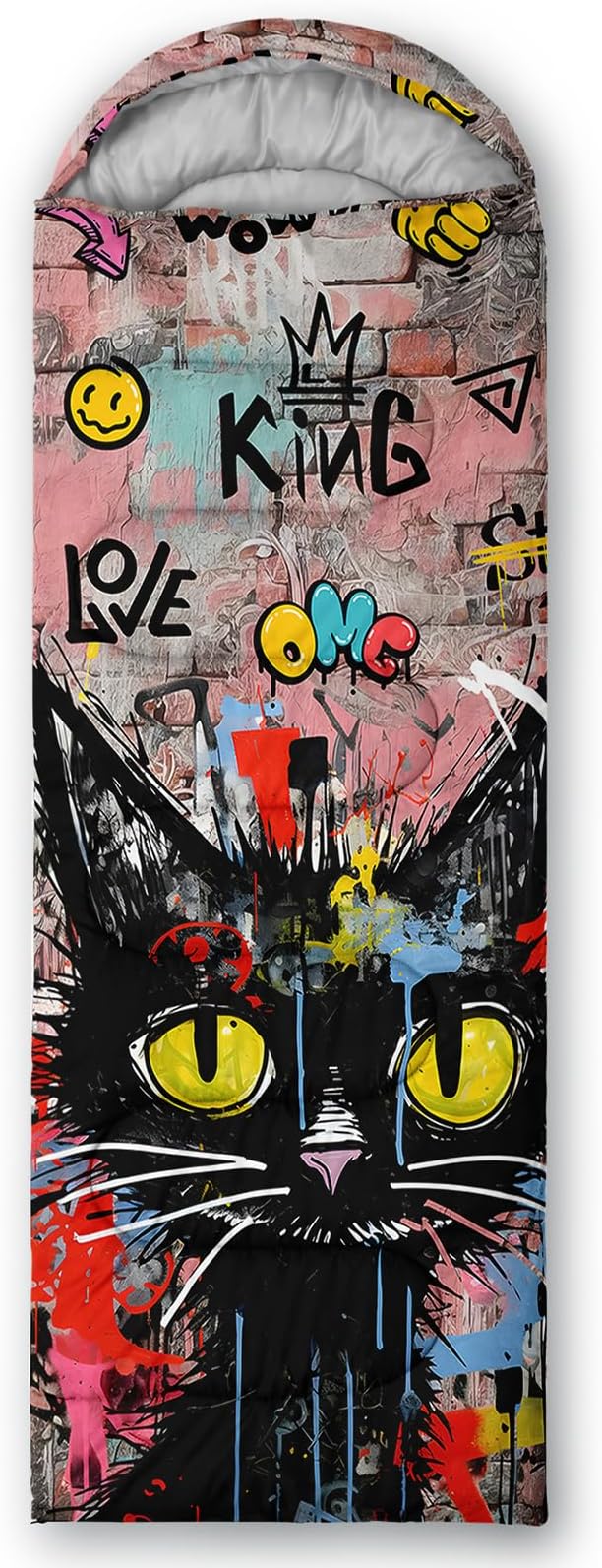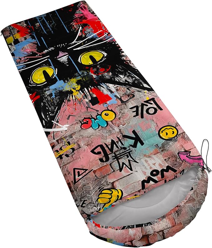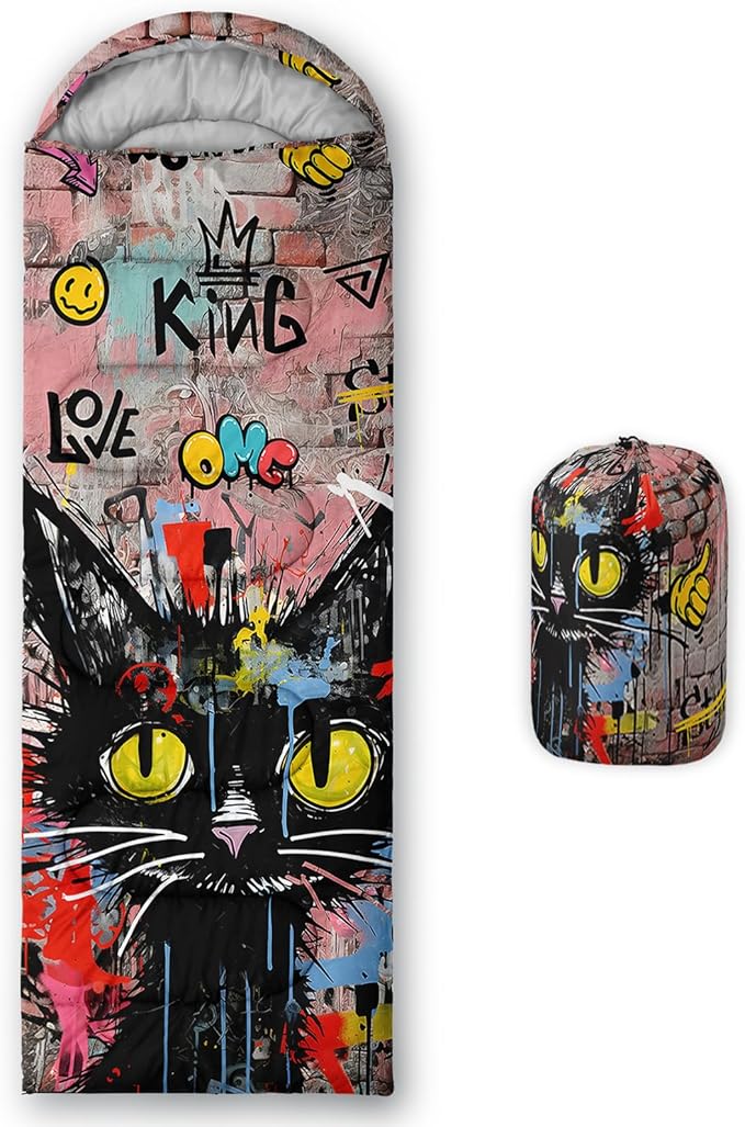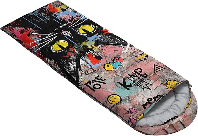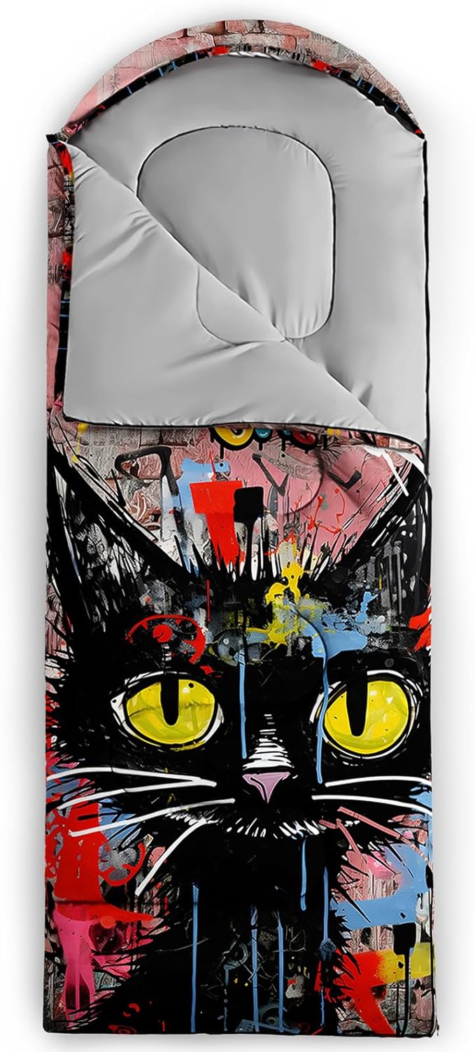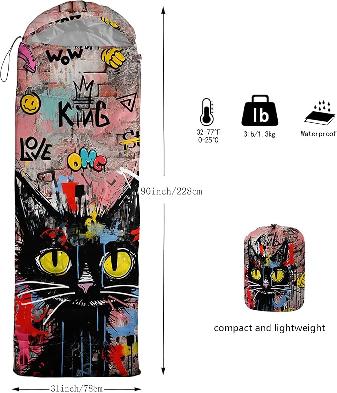 • Unique Cat Design:This Cat pattern sleeping bag is made of 3D digital printing with vibrant colors and patterns,size: 31W x 90L inches,temperature range: 32℉-77℉ (0℃-25℃),it also also have a weather resistant waterproof design to keep you warm and prevent you from any dampness,can be used in 3 seasons