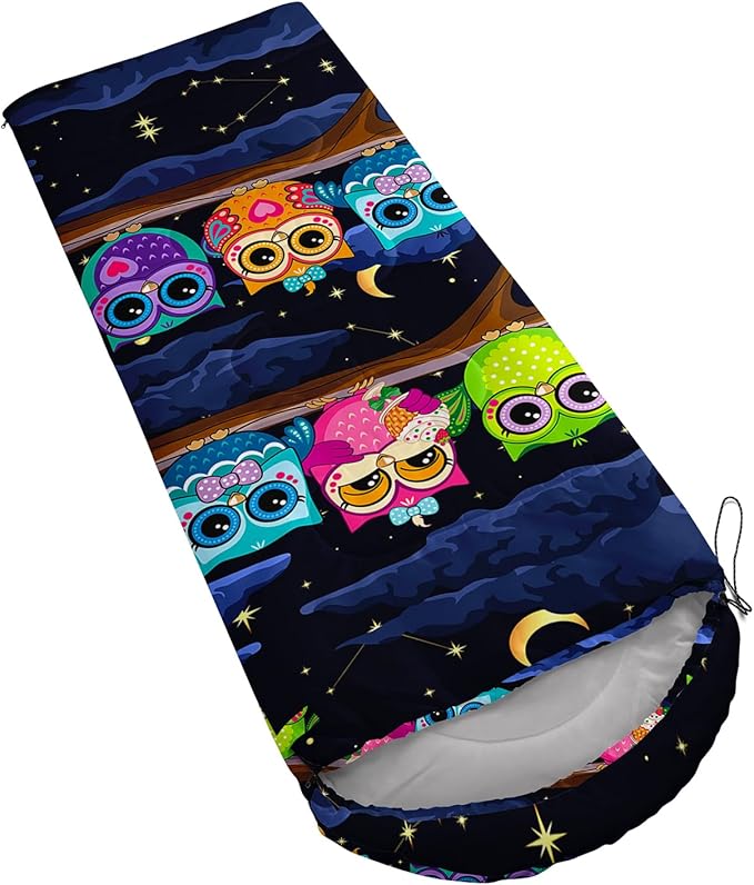 • Unique Owl Design:This Owl pattern sleeping bag is made of 3D digital printing with vibrant colors and patterns,size: 31W x 90L inches,temperature range: 32℉-77℉ (0℃-25℃),it also also have a weather resistant waterproof design to keep you warm and prevent you from any dampness,can be used in 3 seasons