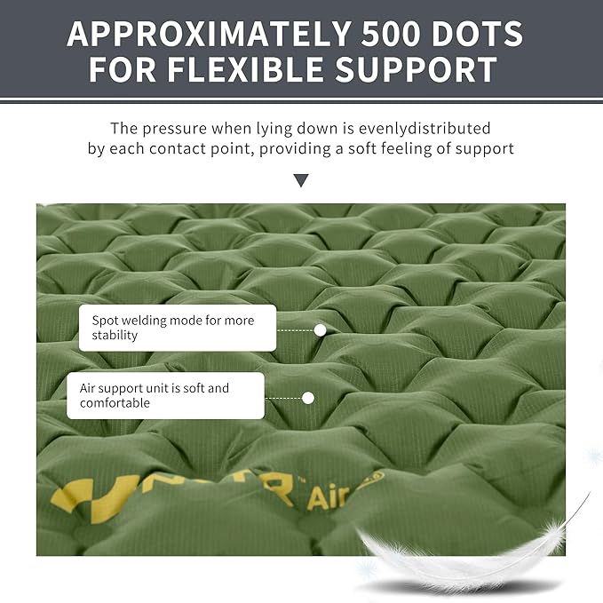 • COMFORTABLE AND STURDY SLEEPING PAD: Punching point structure, providing tough support, the pressure is evenly distributed by each contact when lying down, providing a soft sense of support, the whole soothing relaxation. 77.17 * 25.2inch/196 * 64cm size is enough for you to turn over freely on the air cushion