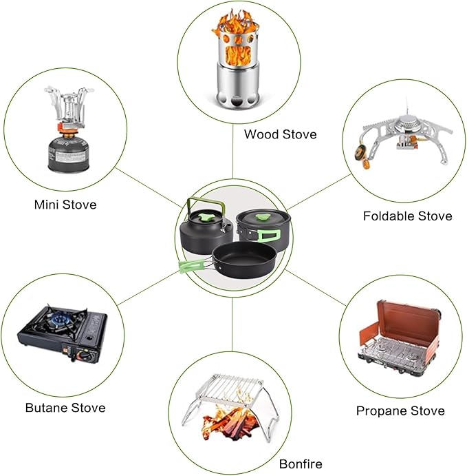 • Widely applicable: Cooking gear for 2 to 3 people travel, can be used on open fire, perfect for camping, hiking, backpacking, picnics, etc; The matching silicone handles are heat-resistant and non-slip, comfortable to hold, ensuring your safety in the process of use