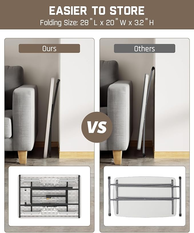 • Durable & Easy To Clean: Foldable table with an HDPE tabletop and sturdy all-steel frame, supporting up to 75 lbs. Features an easy-to-clean surface, matte non-slip surface. Plastic foot caps to prevent sliding and floor scratches