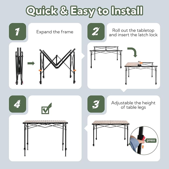 • Portable and Easy to Install: The camping table features a folding design, allowing it to be quickly and easily set up or folded without tools, saving you time and space. The folded size is 33"L x 11"W x 4.7"H. After folding, store it in the carrying bag for convenient outdoor transport and storage; it can easily fit in the back of a car, RV, or motorcycle.