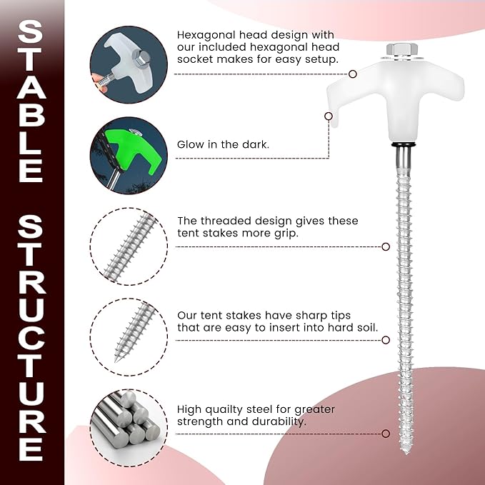• Wide Range of Applications: These screw-in stakes are suitable for most types of terrain, including sand and soil. Perfect for you to secure your tent, canopy, canopies, tarps, picnic mats or even to secure your dog leash, Christmas decorations, new years decorations, yard decorations, garden decorations, they are quite useful camping travel tools