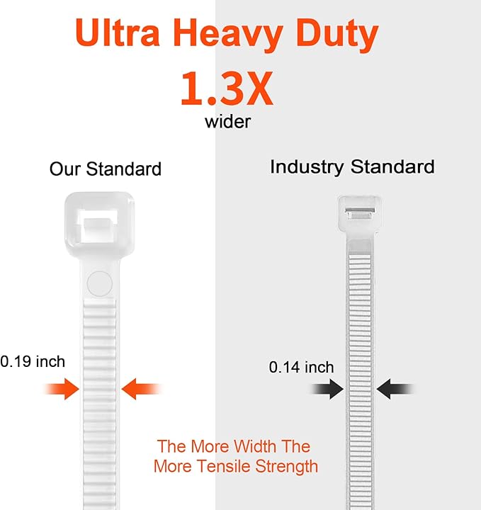 • 【Heavy Duty Zip Ties 120LBS】: The more width and Thickness, the more tensile strength. our clear zip ties 18 inch width is 0.19 inch(4.8mm), while industry standard is 0.14 inch(3.6mm), our zip ties 18 inch Thickness is 0.065" inch(1.65 mm), while industry standard is 0.05 inch(1.25mm),more tensile strength.