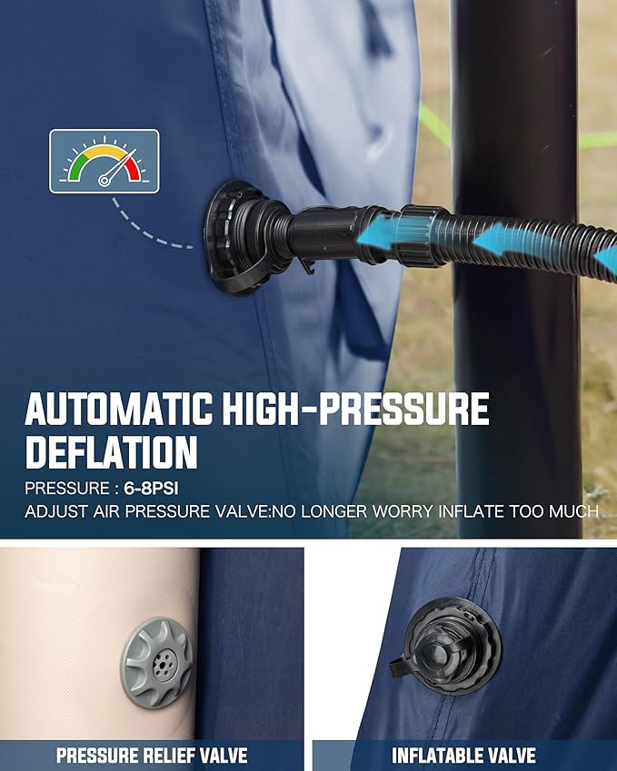 • 【EASY INSTALLATION】The inflatable camping tent does not need manual installation of support rods, and it has TPU inflatable pillars. Equipped with a manual hand pump, then you can finish assembling the camping tent in only 5 minutes.Equipped with durable steel nails and windproof rope make the tent more stable. Make your camping trip more enjoyable and comfortable.