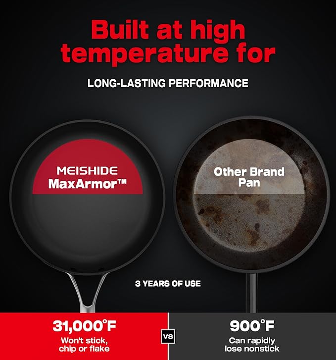 • 100% Non-Toxic & No PFAS/PFOS/PFOA/BPA: Proven Safety - A team led by Dr. Takahashi (with members from the University of Tokyo and California Institute of Technology) has conducted 1,739+ lab tests to ensure zero chemical release even at 500°F, and crafted with our team development MaxArmor nonstick technology coating, healthier cooking with 57.39% less oil. Perfect for eggs, pancakes, or grilled cheese.