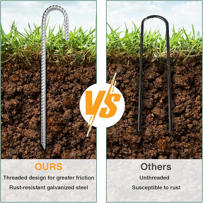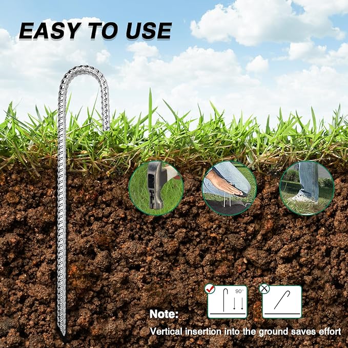 • STABILIZING THREADED DESIGN - Threaded rebar stakes improve grip and stability and can be adapted to a variety of terrains, such as turf, plastic sheeting, thick soil and mats.