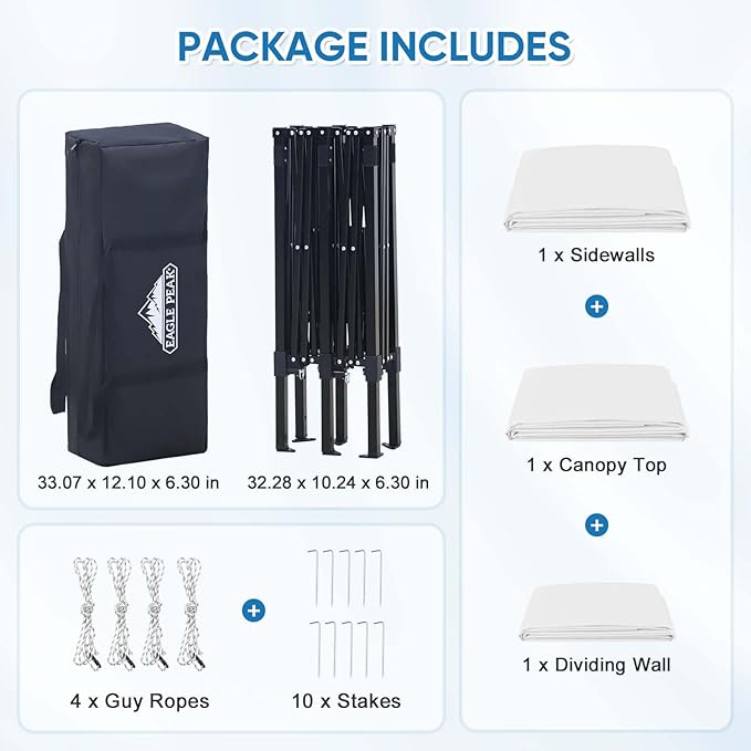 • EAGLE PEAK PROMISE: EAGLE PEAK offers a 1-year limited after sale protection from the original date of purchase. Unlike many other canopy manufacturers, EAGLE PEAK offers this for our frames, canopies and bags! If you have any other questions, please contact our professional service team.