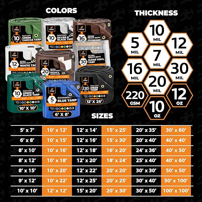• DEPENDABLE FOR EVERY DAY - At 7 mil thick, this tarp offers a combination of durability and convenience. It's suitable for covering equipment, vehicles, or as a temporary fix for unexpected situations - reliable and dependable under many conditions and uses. FINISHED SIZE: Xpose Safety Premium Tarps Run True to Size.