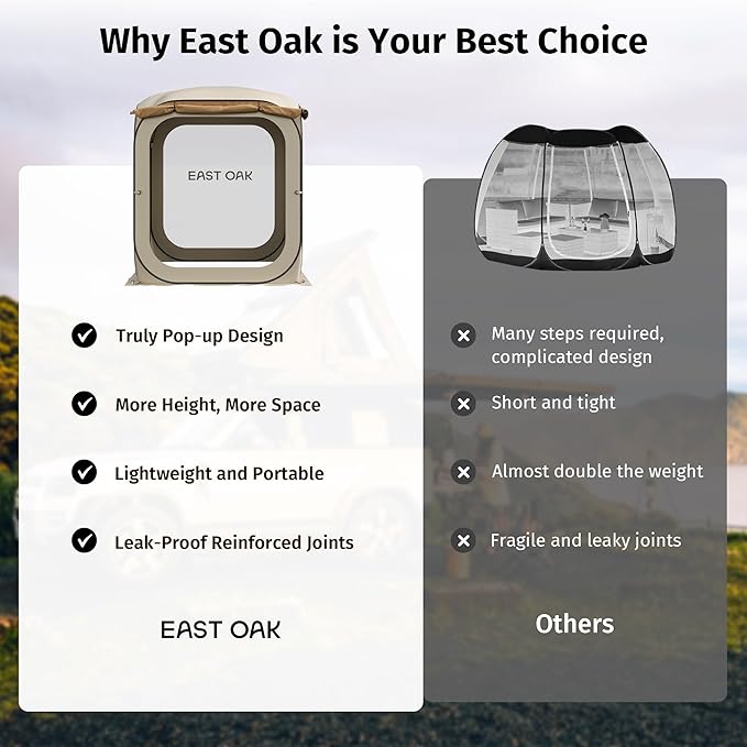 • 𝗩𝗲𝗿𝘀𝗮𝘁𝗶𝗹𝗲 𝗔𝗹𝗹-𝗶𝗻-𝗢𝗻𝗲 𝗧𝗲𝗻𝘁: Engineered for complete outdoor protection, our tent features bug-proof mesh, waterproof walls, and wind-resistant construction. The expandable design offers extra space when needed, while vehicle-connect capability turns your car into a basecamp—delivering 360° coverage for all your adventures. One EAST OAK tent outperforms three ordinary tents.