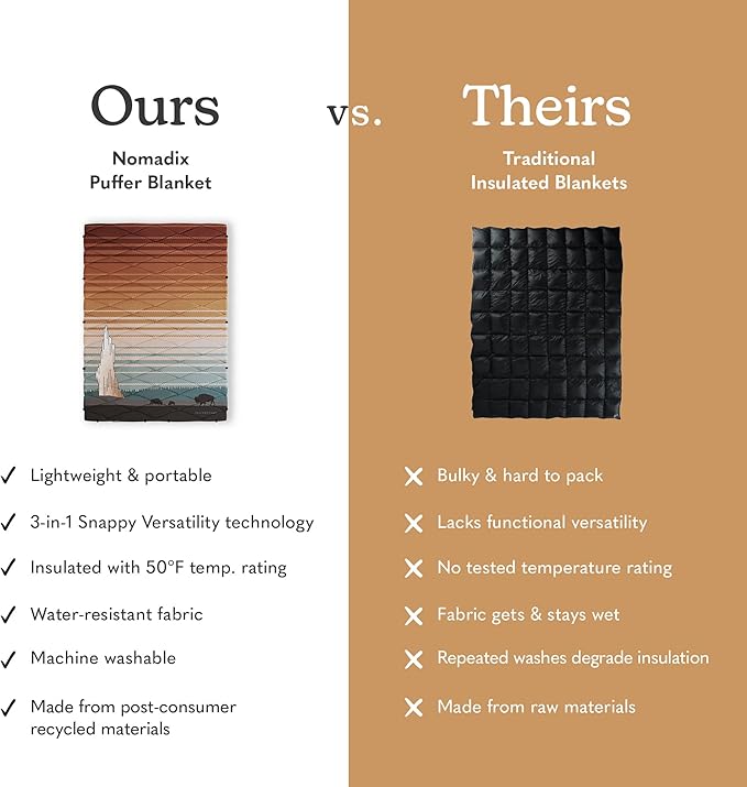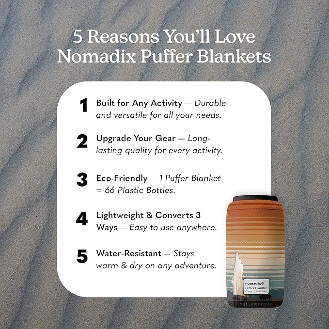 Nomadix Yellowstone Puffer Blanket – Water-Resistant, Eco-Friendly Insulated Blanket with Snaps for Camping, Beach, and Travel, Made from Recycled Materials