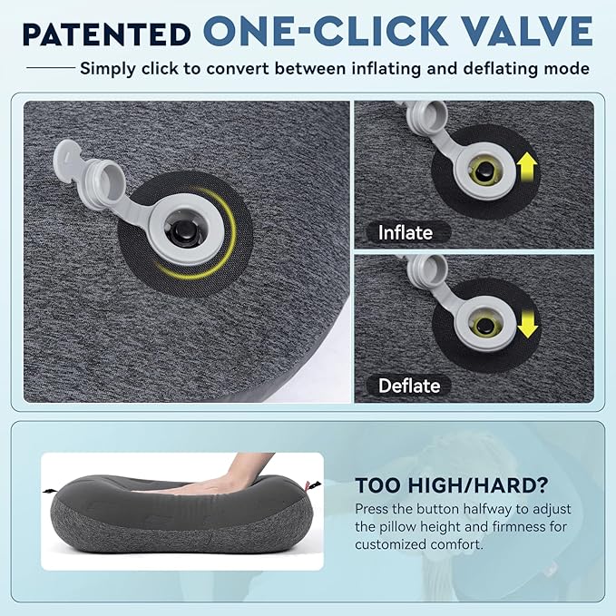• ONE CLICK, ADVENTURE MADE SIMPLE - Simplify your camping setup with our sleeping bag pillow’s innovative one-click valve system, designed for effortless inflation and deflation. No more fumbling with complex mechanisms - adjust the compact travel pillow's firmness with a simple press of a button, and focus on what truly matters: enjoying the great outdoors. Efficiency meets convenience with our intuitive design!