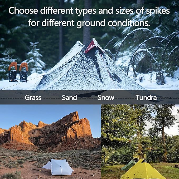 • 【Ultralight & two size】: Weighing only 9 grams/0.01LBS and 12 grams/0.02LBS per peg, it doesn’t add unnecessary weight to your pack. Both 15cm/5.9'' and 20cm/7.8'' are long enough to make tents firmly grasp the length of the ground. Spike diameter 8.5mm/0.33''.
