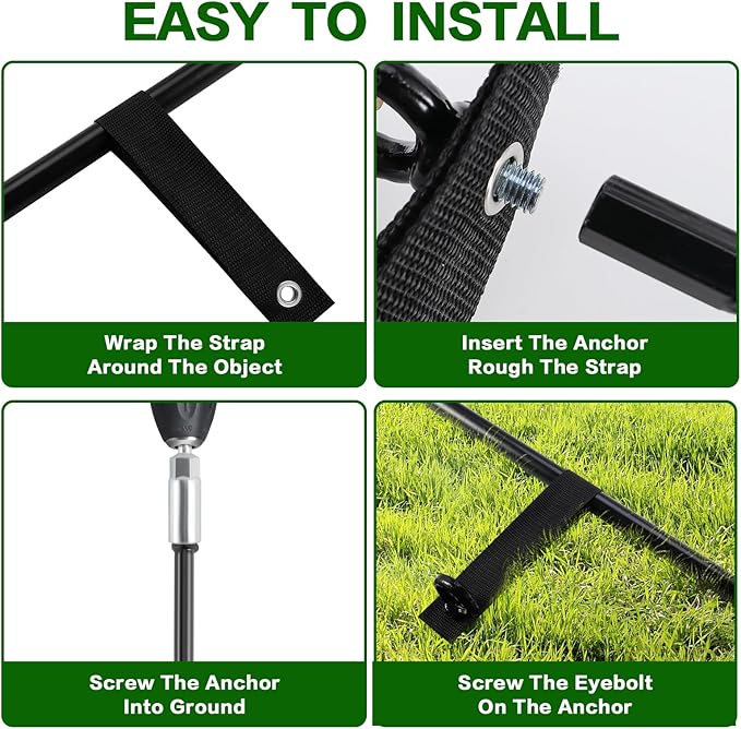 • User-friendly: The heavy-duty trampoline anchors kit includes 4 anchors, a T-shaped socket-wrench, 4 straps, a power nut driver for attaching to a drill, screwed into the ground easily, suitable for campers, gardening enthusiasts and outdoor workers