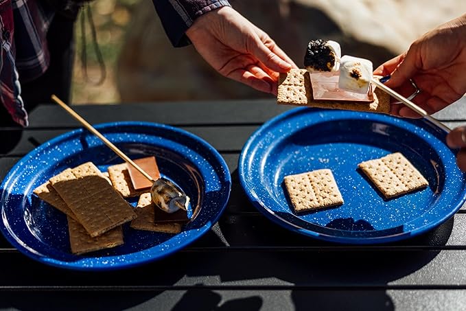 • Enamel Coated Steel: This Enamel dishware is made of durable steel with blue speckled enamel coating for that classic camping dishware style.
