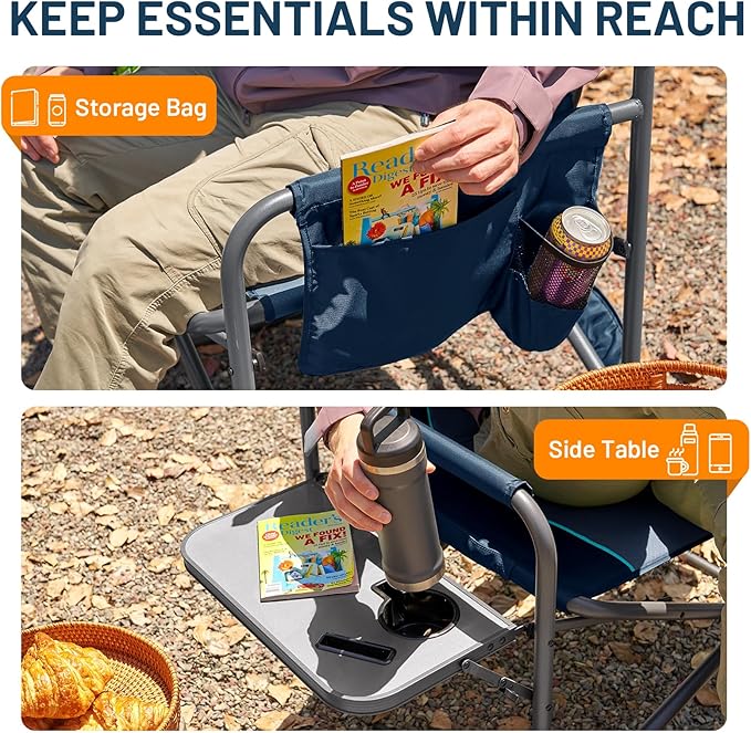 Timber Ridge XXL Director’s Chair – Heavy Duty Folding Chair with Side Table, 500 lb Capacity, Extra Wide Padded Seat for Camping, Sports, Beach, Patio, and Outdoor Use, Blue