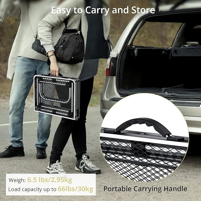 • Easy Portable Assembly: This folding camping table can be set up or folded to the size of a briefcase in less than a minute and comes with carrying handles, making it very easy to carry and store. Perfect for storing in your car, camper, backpacks, rafts, motorcycle rear seats
