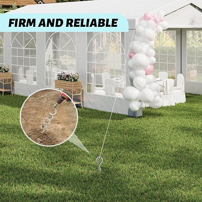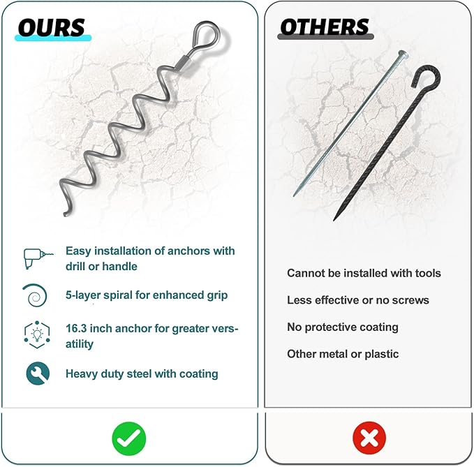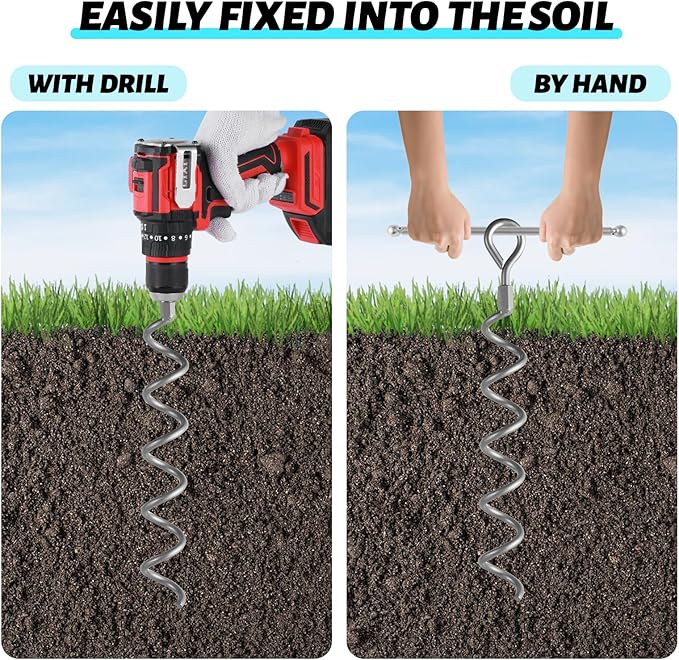 • Firm & Stable: Heavy duty ground anchors are composed of sturdy steel with a spiral design that reduces strain and better ensures stability and longevity. It won't move or break easily even when used in bad weather