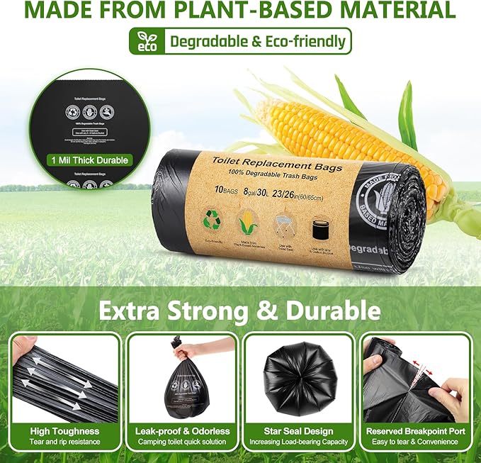 • 【Easy To Use & No Mess】BLIKA portable toilet kit is perfect to be accompanied with 8-gallon toilet replacement bags and eco absorbent gel. After using, rinse the seat with wipe paper as needed to keep clean. Camping toilet bag is made of plant starches and contain NO polyethylene. The portable toilet absorbent gel can quickly turns waste liquid into a solid gel that won't leak or splash out and gives off a light lemon scent.