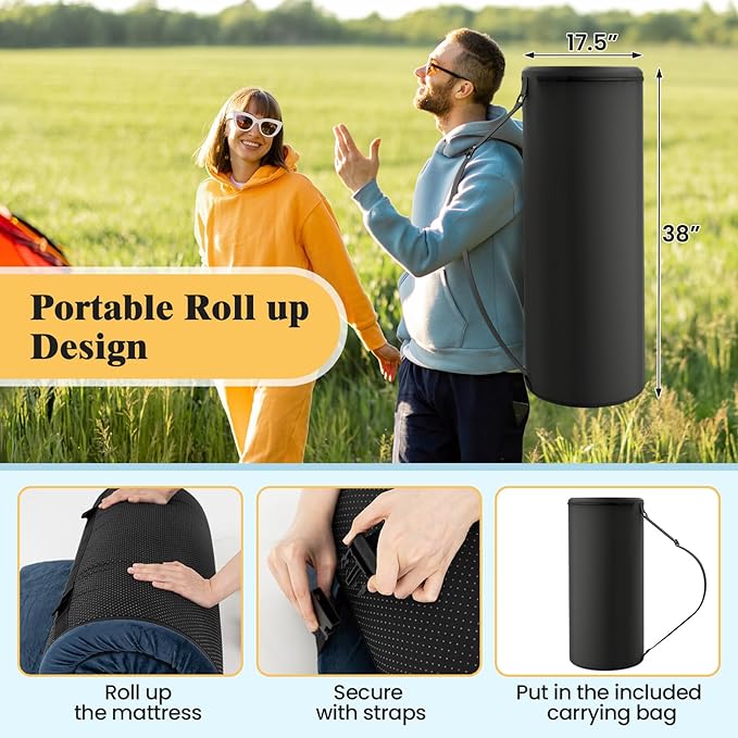 • Foldable & Portable Design: The waterproof floor mat can be effortlessly folded into a compact size when not in use. You can simply roll up the mattress, secure it with straps, and then put it in the included carrying bag. The foldable design makes it easy to transport, allowing you to take it wherever you go.