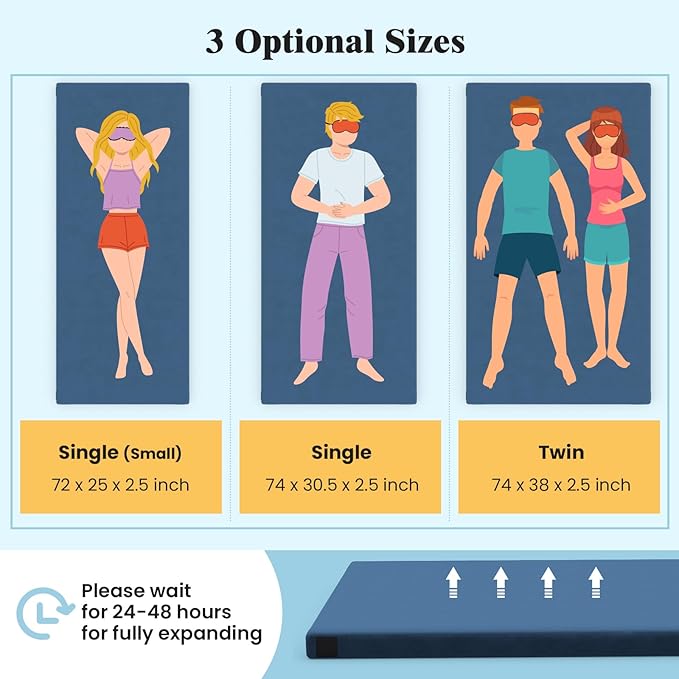 • 3 Sizes to Choose from: The memory foam camping mattress offers 3 available sizes to suit your specific needs: single(small) measures 72 x 25 x 2.5", single measures 74 x 30.5 x 2.5", or twin measures 4 x 38 x 2.5". Please wait for 24-48 hours for fully expanding.