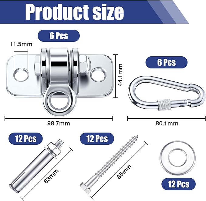 • Ample Quantity and Versatility: each package comes with 6 swing hangers along with 6 locking hooks, 12 screws, 12 expansion bolts, and 12 washers; These swing hangers are versatile and suited for many applications, such as gymnastics rings, porch swings, yoga swings, punching bags, boxing equipment, hammocks, swing chairs, and more