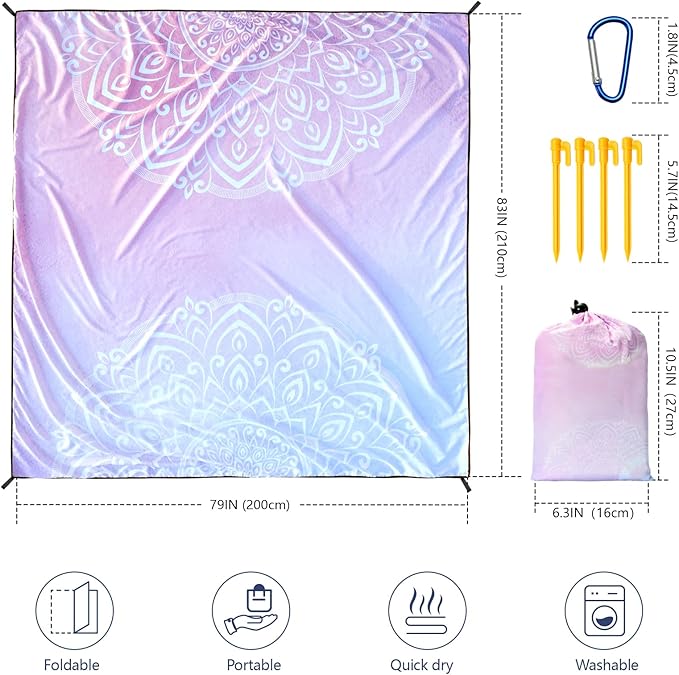 • 🌴【Lightweight Beach Items】79"*83" beach blanket oversized, weighted 0.71 lbs, fit 1-3 adults, and they can be easily folded into a 5.1"×7.5" carry bag.