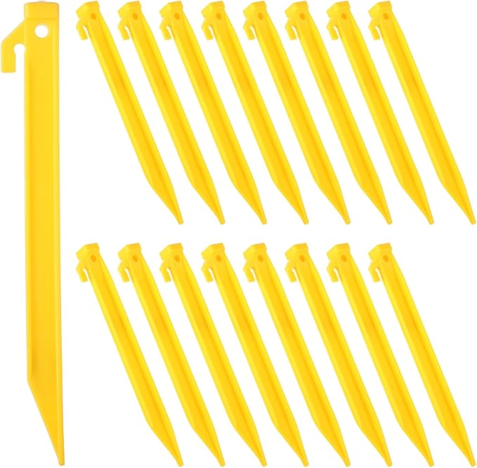 • Ample Set: Includes 50 yellow plastic tent stakes, enough for your use and replacement needs; each stake measures 8.7" in length, fitting most tents and outdoor setups; designed to withstand strong winds and keep your gear securely fixed