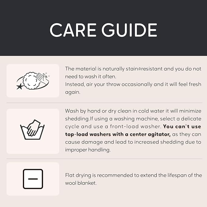 • EASY MAINTENANCE-Thanks to wool blanket, it has self-cleaning function, so it is usually washed once every one or two years.Instead, air your throw occasionally and it will feel fresh again. A little shedding is normal during the first wash, but if you can wash by hand or dry clean in cold water it will minimize shedding. In this way, the wool blanket can be protected and the service life of the wool blanket can be extended, and it may also accompany your life directly.If using a washing machine, select a delicate cycle and use a front-load washer. You can't use the top-load washers with a center agitator, as they can cause damage and lead to increased shedding due to improper handling.