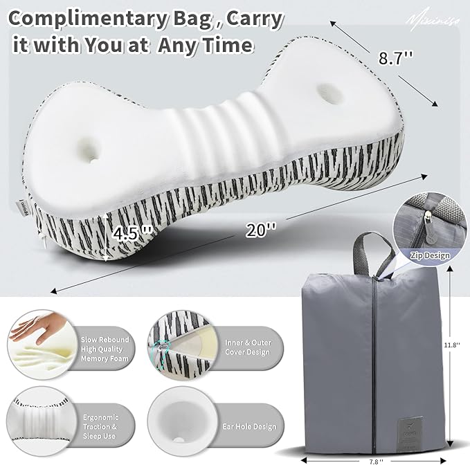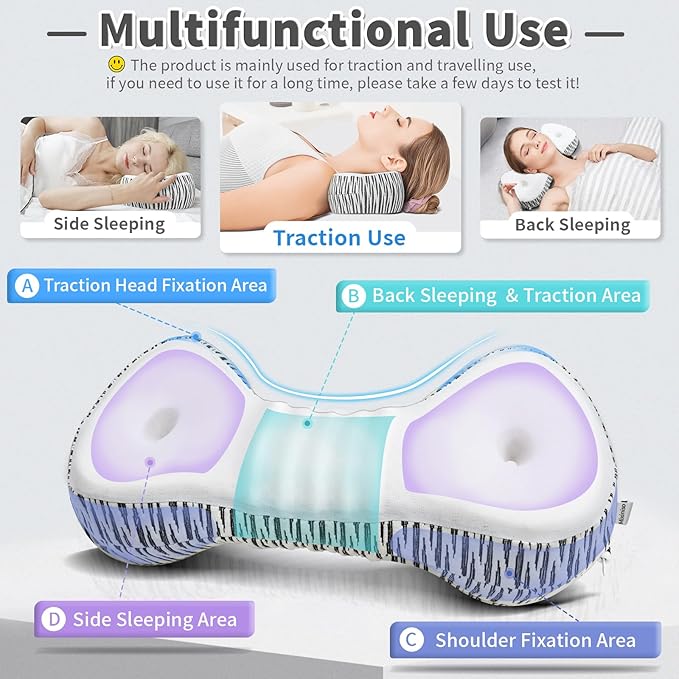 • 🌙【2-in-1 design】Mixiniso have upgraded the cervical traction pillow so that the pillow retains the traction function while improving the comfort of use. The product is soft and firm, so you can control the traction time according to your actual situation without damaging your neck. Unique design allows it to hold your head in place while using. It can be used as a traction device or as a regular pillow, and the hollow design on both sides makes sleeping on the side no longer presses on the ears.