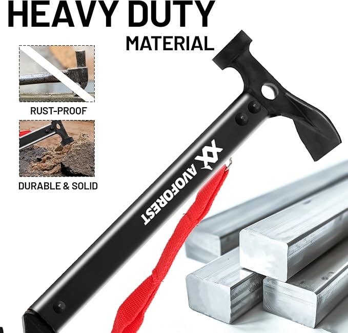 • Multifunctional Tool:Tent hammer head drives stakes effortlessly. Reverse hook extracts stubborn anchors, while the camping shovel tackles campsite leveling, firepit prep, and debris clearing.
