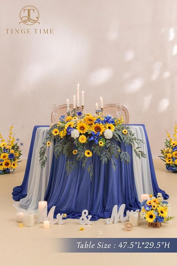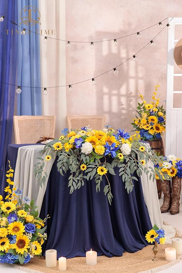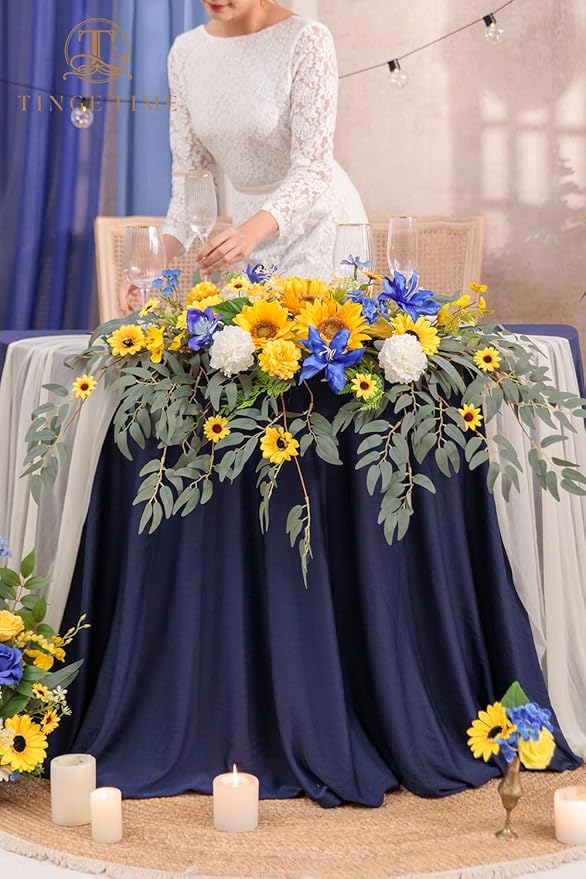 TINGE TIME Artificial Sweetheart Flower Swag with Tablecloth and Table Runner, Pack of 3 Floral Arrangement for Wedding Sweetheart Table Centerpiece Decoration Valentine's Day (Sunflower&RoyalBlue)