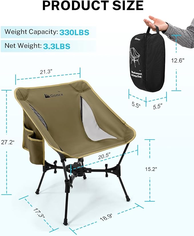 Gonex Portable Camping Chair, The 5th Gen Ultralight Compact Backpacking Foldable Lightweight Folding Chair for Outdoor Camp Hiking Beach Picnic Concert, Supports 330lbs (Khaki,1PCS)