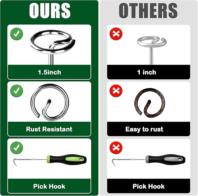 • 【Package Included and Size】The 8 gauge (4mm in wire diameter) 120 Pack landscape fabric staples are 6 inches long, the G shaped circle top width is 1.3 inch. In addition, we also equipped with 1 pick hook. The pick hook can pull the landscape pins out effortlessly, making it a perfect accessory for maintaining artificial turf and weed barrier fabric.