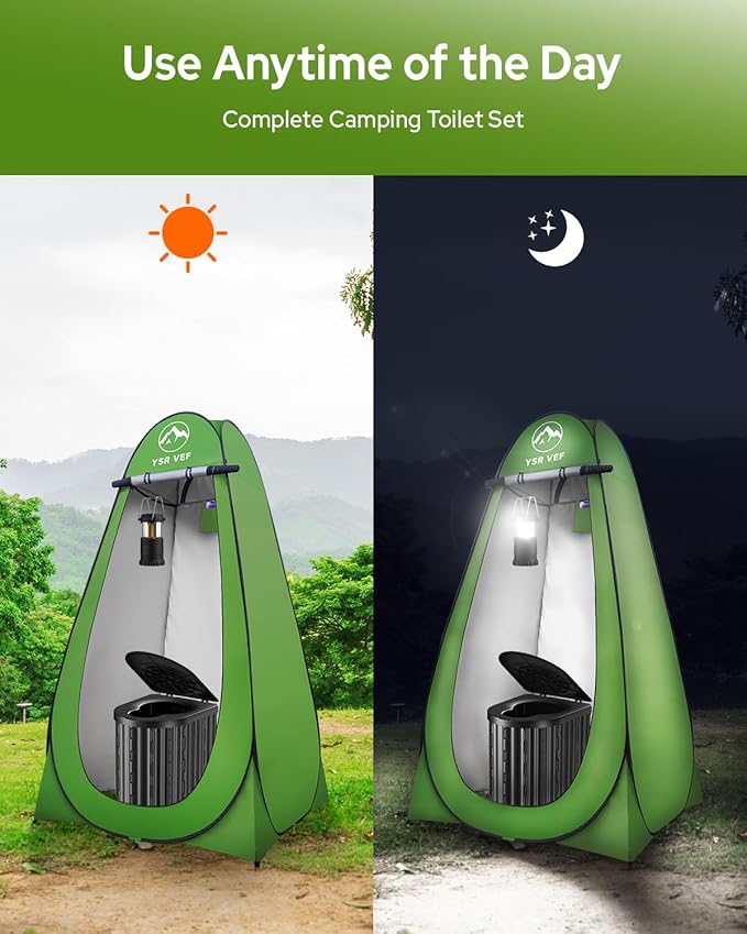 • ALL-IN-ONE PORTABLE TOILET KIT – Includes an ergonomic folding toilet, pop-up privacy tent, 12 trash bags, and 12 poo gel. The entire set folds into a compact 22" storage bag that’s easy to carry and store, perfect for outdoor use and emergency preparedness.
