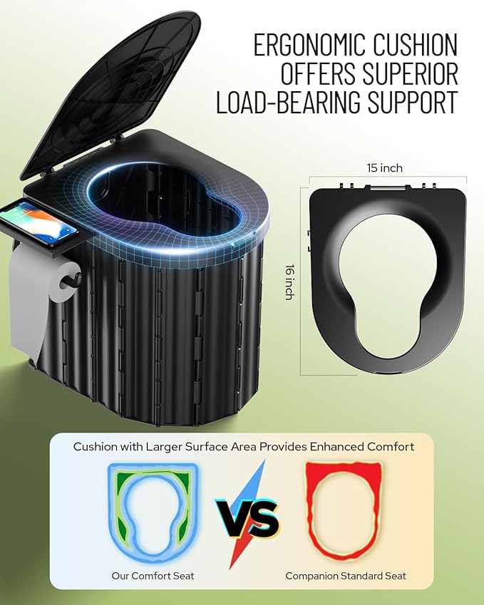 • ERGONOMIC CAMPING TOILET – Designed with a larger, taller seat and extra cushioning for enhanced comfort, especially for the American body. Foldable, sturdy, and able to support up to 400 lbs, it’s suitable for users of all ages.