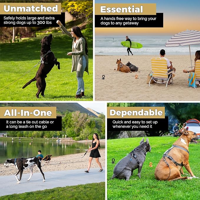 Dog Tie Out Cable and Stake 30ft - for Large Dogs up to 300 lbs - Heavy Duty Tether and Dog Stake for Yard, Beach & Camping Outside (Black, L/XL - 30ft)