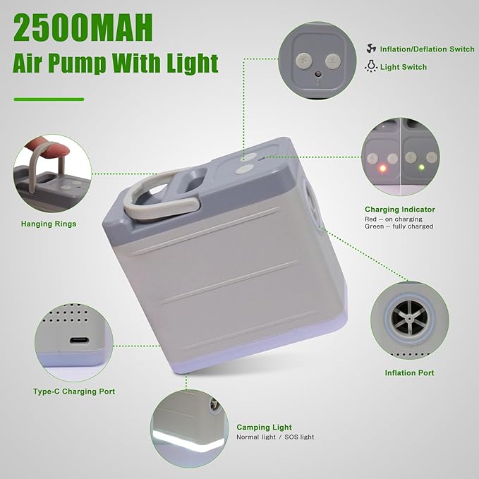 • ใ€๐—ฅ๐—ฒ๐—ฐ๐—ต๐—ฎ๐—ฟ๐—ด๐—ฎ๐—ฏ๐—น๐—ฒ & ๐—ฅ๐—ฒ๐—บ๐—ผ๐˜ƒ๐—ฎ๐—ฏ๐—น๐—ฒ ๐—œ๐—ป๐˜๐—ฒ๐—น๐—น๐—ถ๐—ด๐—ฒ๐—ป๐˜ ๐—”๐—ถ๐—ฟ ๐—ฃ๐˜‚๐—บ๐—ฝใ€‘- The built-in air pump contains 2*2500mAh high-capacity battery, can fill inflatable camping pad quickly. Pump is rechargable and removable. One full charging time 3.5 hours and can inflate the memory foam sleeping pad about 7 cycles. Air pump features normal light and SOS light function, convenient for camping. it also has a hook to be attached to the tent. Pls not use it continuously for more than 5 mins and Let it cool down before using again.