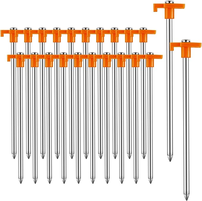 • Premium Material: These heavy-duty tent stakes are made of galvanized iron, sturdy and durable. They will not bend or break under pressure and can be firmly fixed even on windy nights