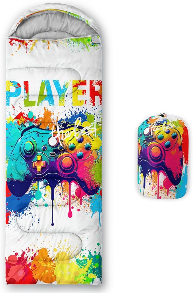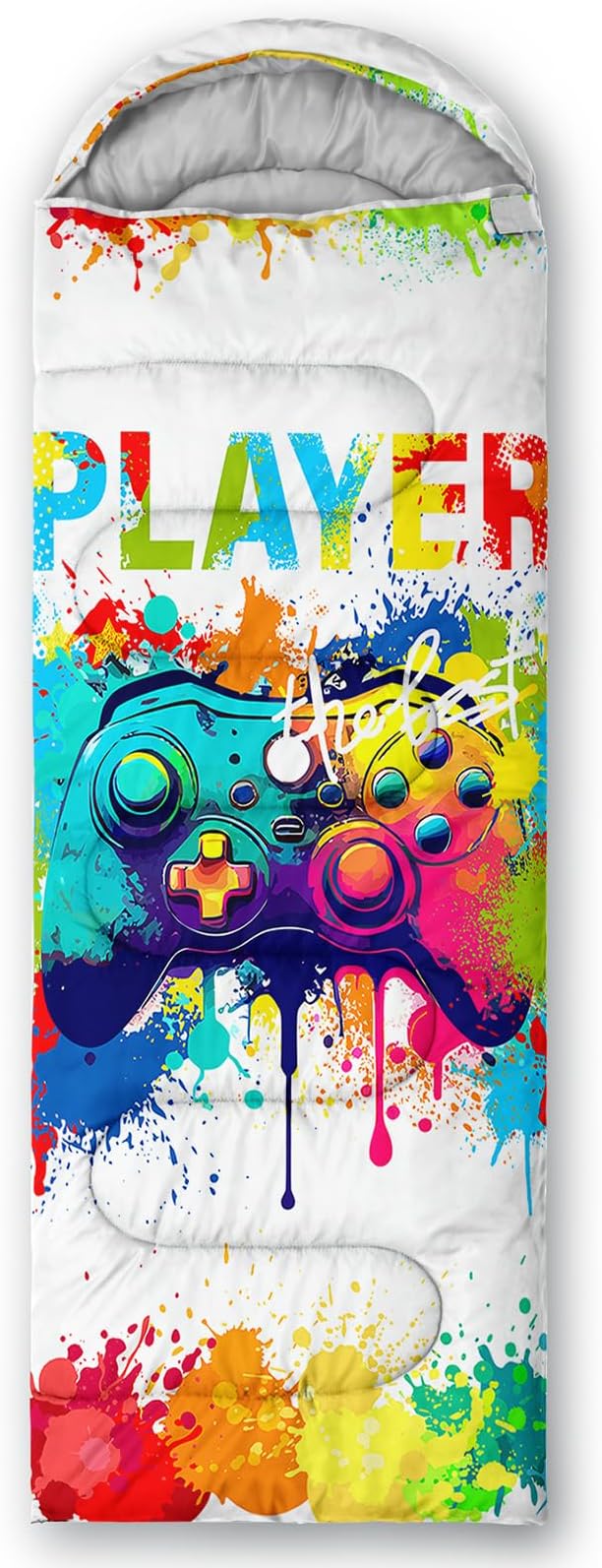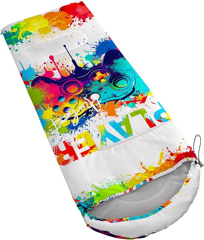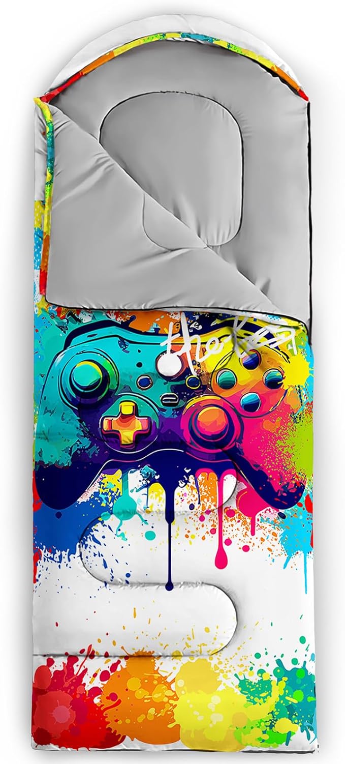 • Unique Gaming Design:This Gaming pattern sleeping bag is made of 3D digital printing with vibrant colors and patterns,size: 31W x 90L inches,temperature range: 32℉-77℉ (0℃-25℃),it also also have a weather resistant waterproof design to keep you warm and prevent you from any dampness,can be used in 3 seasons