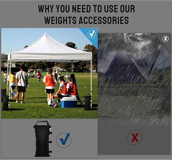 • 【EASY TO FILL & REUSE】 The canopy tent weights feature sturdy built-in handles, making them easy to carry, fill, and install. Simply fill with sand, rocks, gravel and bottled water, then attach to your canopy legs for quick setup and takedown. They can be reused for future events.