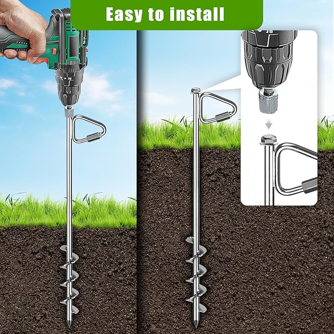 • 𝑯𝒆𝒂𝒗𝒚 𝑫𝒖𝒕𝒚 𝑮𝒓𝒐𝒖𝒏𝒅 𝑨𝒏𝒄𝒉𝒐𝒓: The 1.6'' wide helix, 10mm solid steel and 17 inch length provide a strong and stable and go deep down allowing good traction, the screw in design is much easier to install than traditional stakes, a practical solution for keeping your outdoor structionres firmly in place, come with a storage bag for portability.