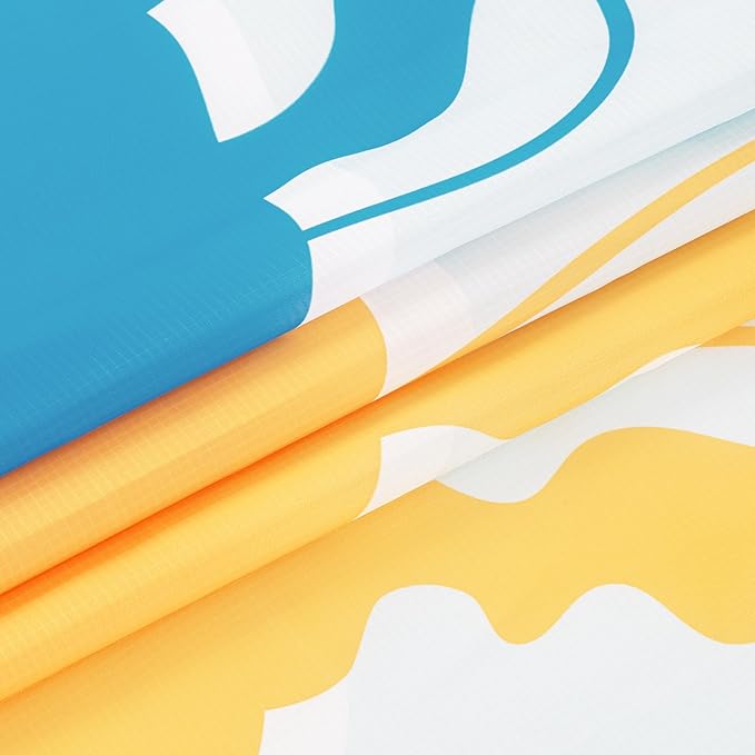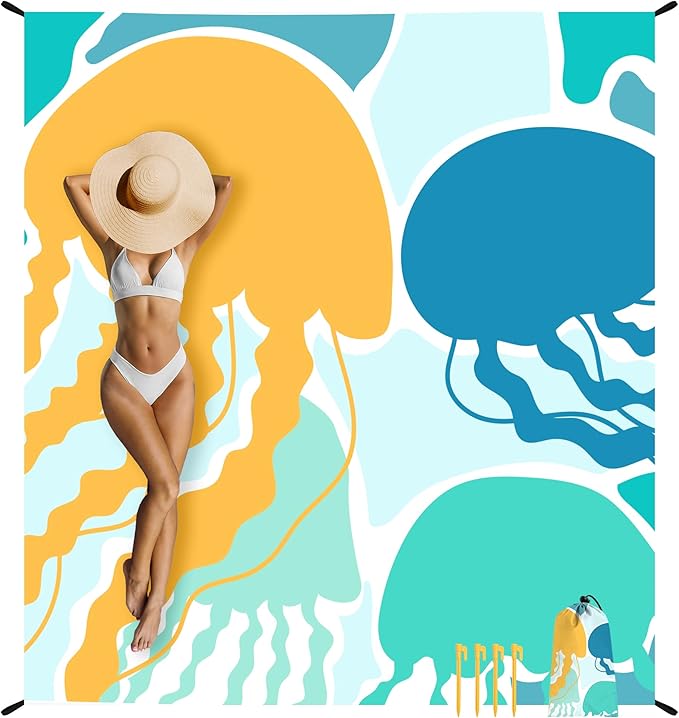 • Unique Jellyfish-Inspired Design & Machine Washable 🏝️🐙 Showcasing a minimalist, abstract jellyfish pattern in shades of blue, aqua, and yellow-orange, this blanket brings an oceanic charm to your outdoor setup. Plus, it’s machine washable for easy care!