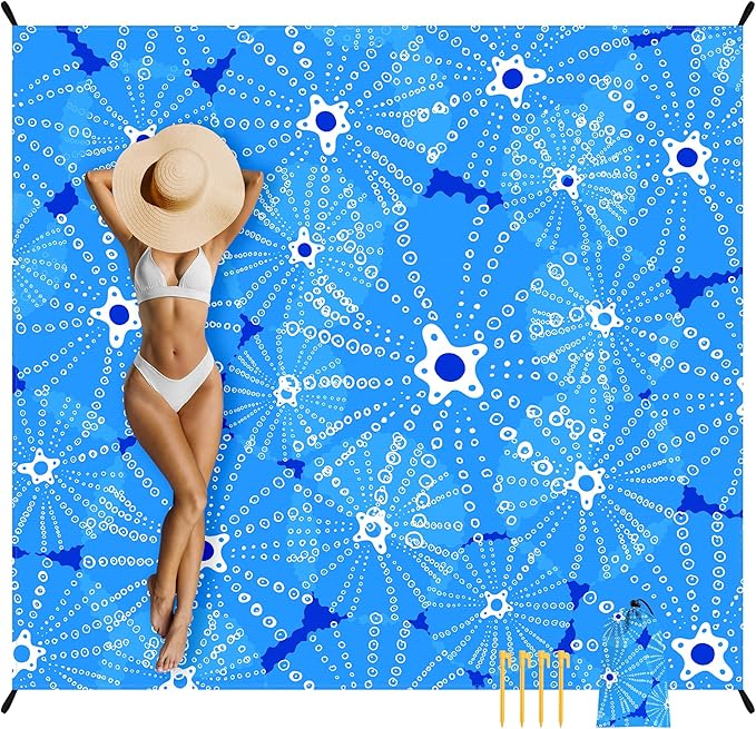 Beach Blanket, 78''×86'' Large Waterproof Sandproof Beach Mat for 2-4 Adults, Lightweight Compact Sand Free Outdoor Picnic Blanket with 4 Stakes & 4 Corner Pockets