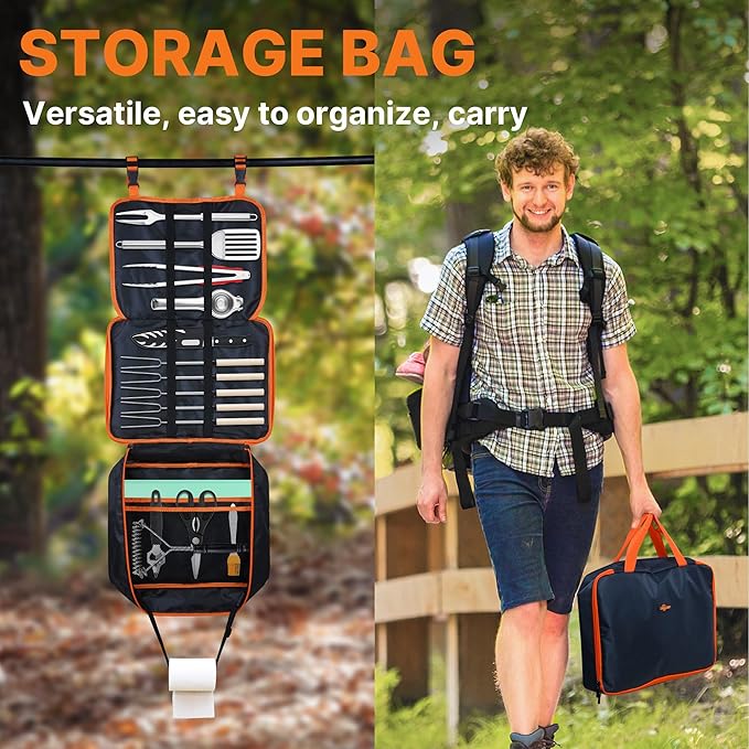 • 【Large Space Organizer Bag】This utensils set comes with a nice large space carrying bag made of Oxford Cloth. It is resistant to dust and water.It's portable, convenient, and large enough to store condiment bottles.You can use it to keep your own utensils, personalize you own cooking kit. A great gift for people who enjoy cookouts.
