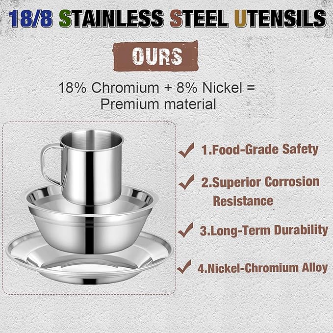 • Complete Dinnerware Set for One: This comprehensive camping dinnerware kit includes an 8 oz stainless steel cup, a 7.87 inch plate, and a 5.9 inch bowl, providing everything you need for meals during school camp outdoor adventures