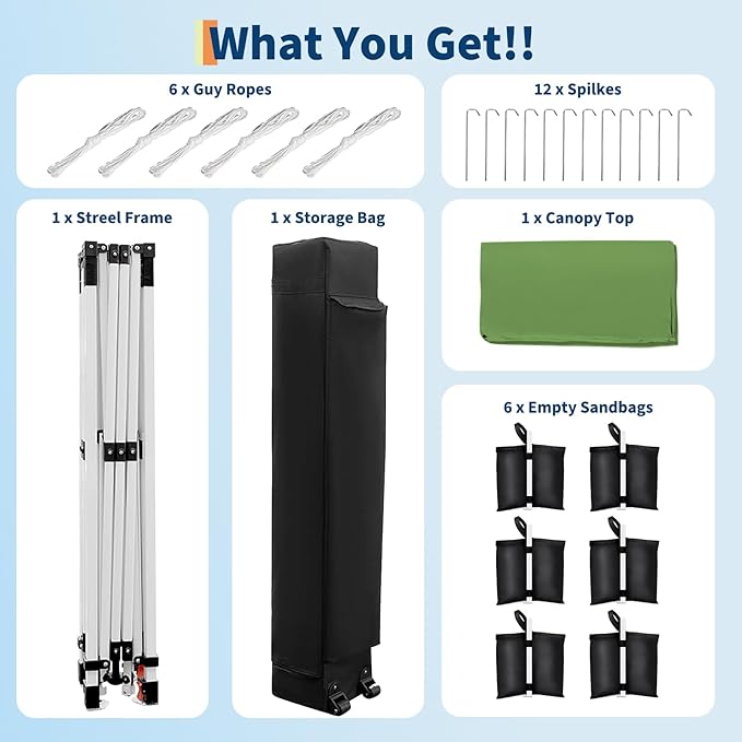 • VERSATILE USE: Our commercial pop-up canopy is suitable for picnics, camping, barbecues, sports, fishing, and other outdoor activities. It can also be used in yards, decks, farms, farmers' markets, beaches, and so on.