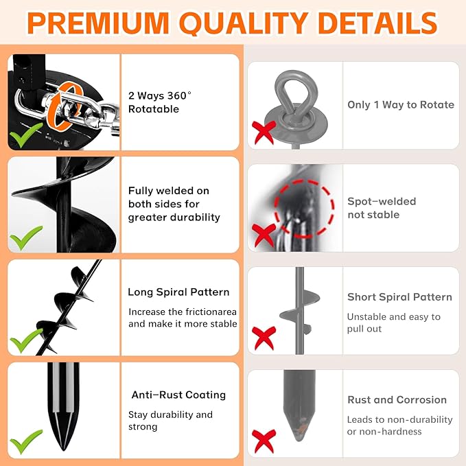 • PREMIUM WORKMANSHIP: The stake features a 360° swivel function to prevent the cable or leash from tangling, enhancing safety. The longer auger blade allows for easier and more secure anchoring of the dog stake in the ground.The surface plastic coating process provides rust protection, extending the product's lifespan
