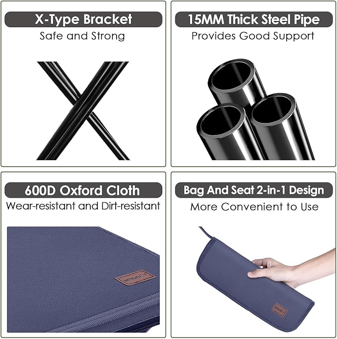 • 【Strong and Durable】To ensure the safety of sitting, we use 15mm thickened steel pipe as the material of the stool legs. In addition, the stool surface is made of 600D Oxford cloth, which is wear-resistant and easy to clean.